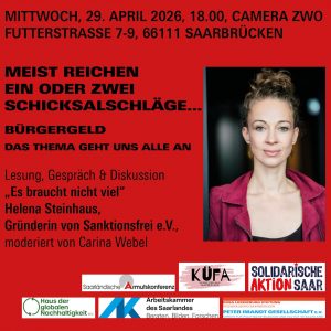 Die Veranstaltung ist eine Kooperationsveranstaltung der Rosa Luxemburg Stiftung Saar mit der Arbeitskammer des Saarlandes, der Solidarischen Aktion Saar, dem Haus der Nachhaltigkeit, der Saarländischen Armutskonferenz und der Küche für Alle.