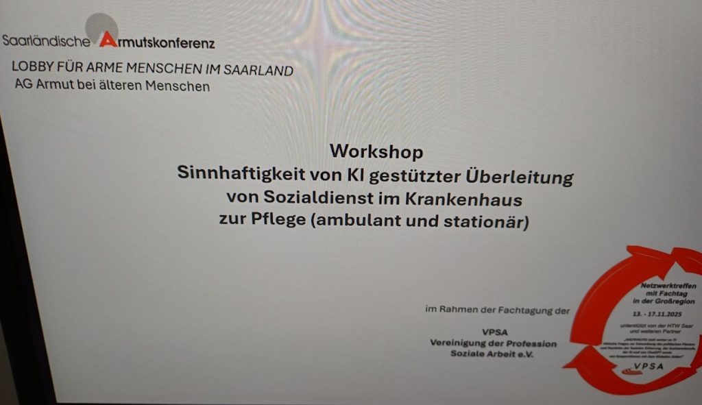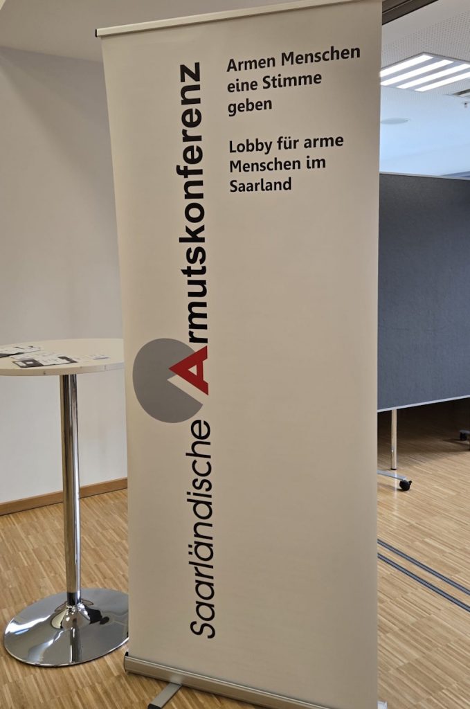 der Vereinigung der Profession Soziale Arbeit e.V. (VPSA) gemeinsam mit der Hochschule für Technik und Wirtschaft Saar (htw saar), Fakultät für Sozialwissenschaften, sowie weiteren Partnern statt. Unter dem Motto „NACHHALTIG statt weiter so!!!“ widmete sich die Tagung ethischen Fragen rund um die Entwicklung politischen Planens und Handelns – von sozialer Sicherung über Assistenzberufe bis hin zu Künstlicher Intelligenz und globalen Kooperationen. Die Saarländische Armutskonferenz e.V. (SAK) war vor Ort vertreten und übernahm ihre zentrale Aufgabe: Gesicht zeigen und Lobbyarbeit für von Armut betroffene Menschen leisten. Besonders im Hochschulkontext, wo die zukünftigen Fachkräfte der Sozialen Arbeit ausgebildet werden, tritt die SAK in den Dialog mit jungen Menschen, um sie für die gesellschaftliche Realität von Armut zu sensibilisieren.